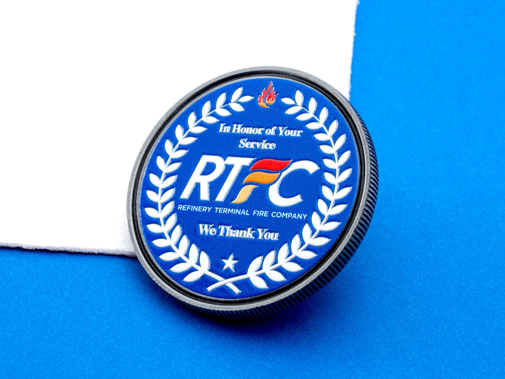 Simulated enamel coins are made from solid metal and are available with antique gold or silver plating. Layers of color are applied directly to the metal surface of the coins to create a depth and texture similar to a traditional challenge coin.