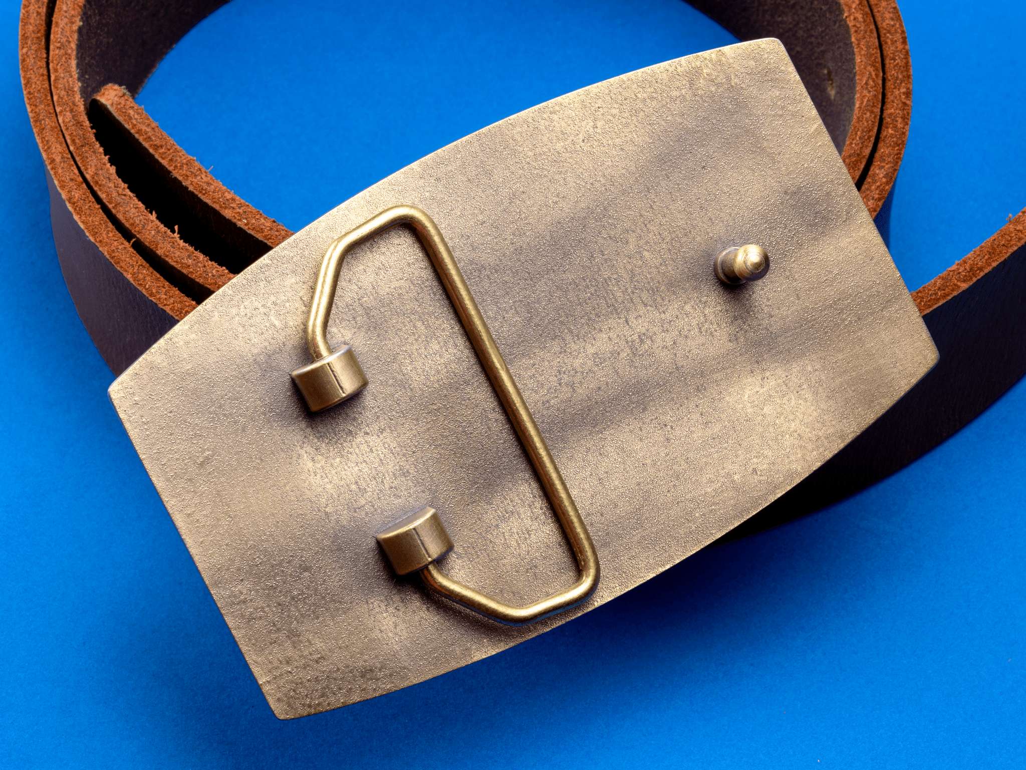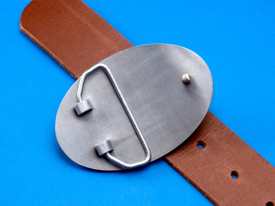 The hinge and hook is the most common belt buckle attachment for leather belts. The back of the buckle has a small hinge (or swivel) that the belt strap threads through, and a hook (or pin) that seats into the punch holes on the belt to lock it in place. This simple, time-tested design means you can easily remove the buckle and attach it to a different belt whenever you want.