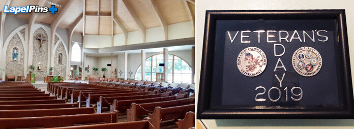 We were contacted by a member of the church named Eleanor Camarata to create these Veterans Day challenge coins. After everything was said and done, she sent us an image of one of the coins in a special display in the church and explained how well the coins were received.