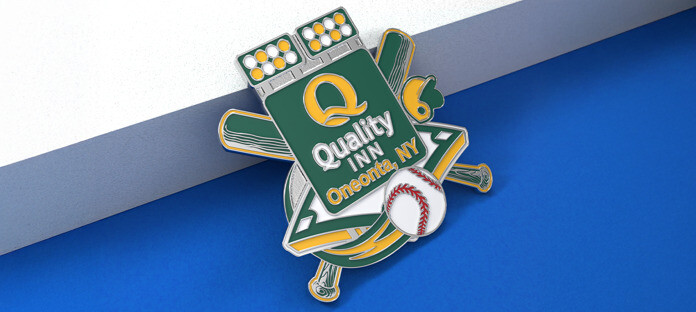 So, both the Hampton Inn and Quality Inn teams decided it was time to design their own trading pins! Inspired by the classic crossed baseball bat design seen on many tournament pins, their designs looked and felt just like the ones being traded around the field. The Hampton Inn pins featured the hotel’s logo in the center and a red, white, and blue color scheme to drive home the connection to America’s pastime, while the Quality Inn created their own version to match their brand and join the celebration in a meaningful way.
