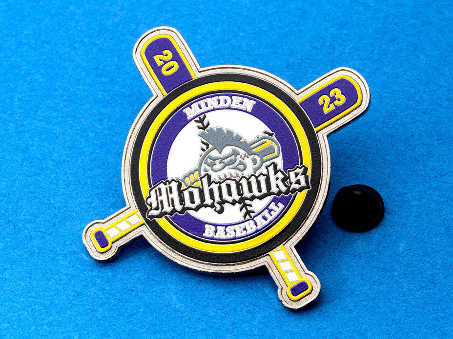 Los pines de intercambio son pines coleccionables personalizados que los equipos deportivos — especialmente de béisbol y sóftbol — crean cada temporada. Los jugadores los intercambian con oponentes en torneos, eventos de Cooperstown y durante toda la temporada. Cada pin es único para el equipo, con el nombre, mascota, deporte, colores y a menudo los números de los jugadores.