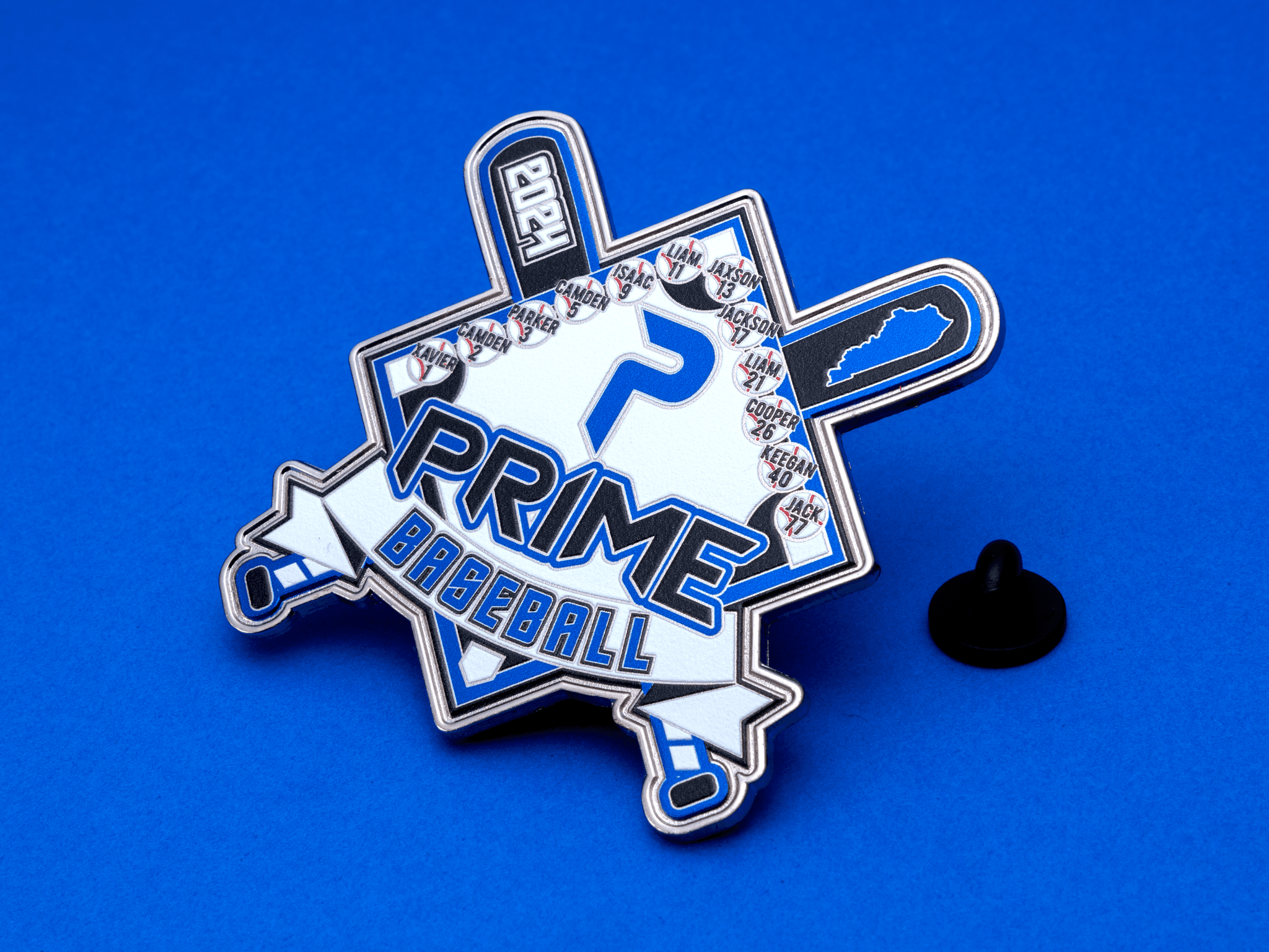 Los pines de intercambio son pines coleccionables personalizados que los equipos deportivos — especialmente de béisbol y sóftbol — crean cada temporada. Los jugadores los intercambian con oponentes en torneos, eventos de Cooperstown y durante toda la temporada. Cada pin es único para el equipo, con el nombre, mascota, deporte, colores y a menudo los números de los jugadores.
