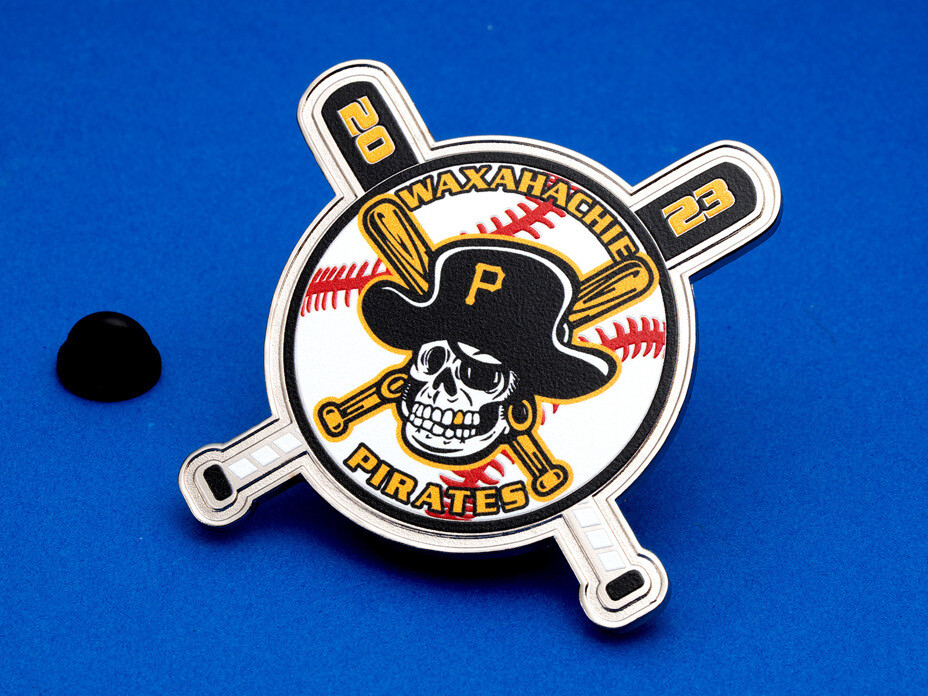 Trading pins are custom-designed collectible pins that sports teams — especially baseball and softball teams — create each season. Players trade them with opponents at tournaments, Cooperstown events, and throughout the season. Each pin is unique to the team, featuring the team name, mascot, sport, colors, and often player numbers.